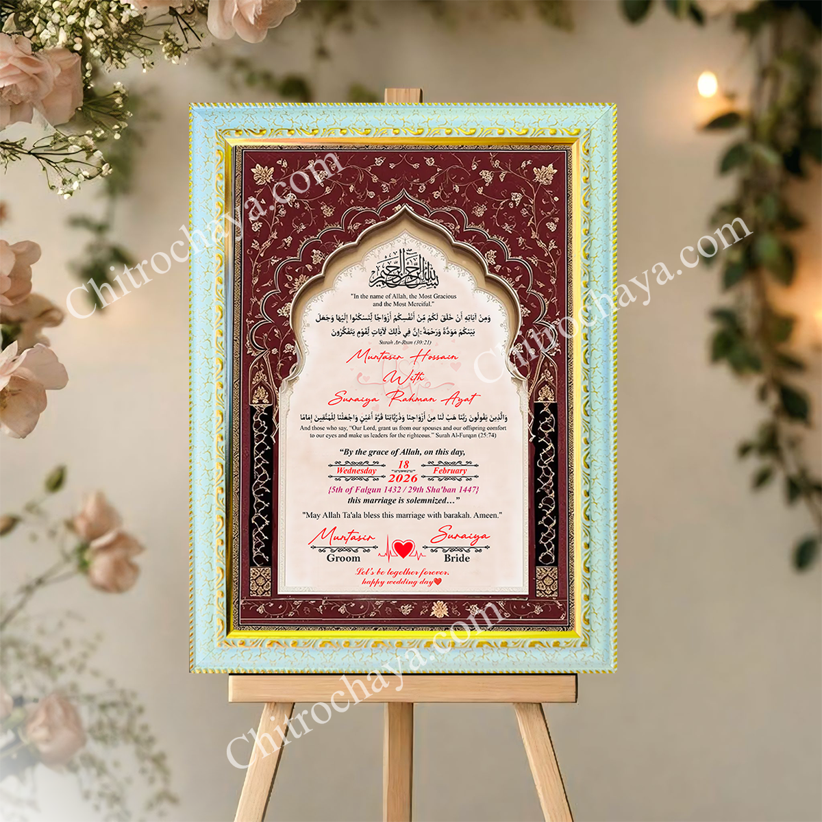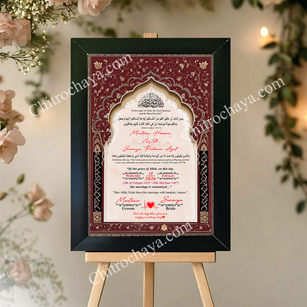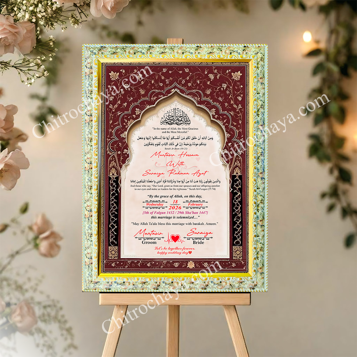 বিঃদ্রঃ নিকাহের তারিখ, বর-এর নাম এবং কনে-এর নাম লিখে দিন। অর্ডার বা যেকোনো তথ্যের জন্য আমাদের ইনবক্স করুন।
