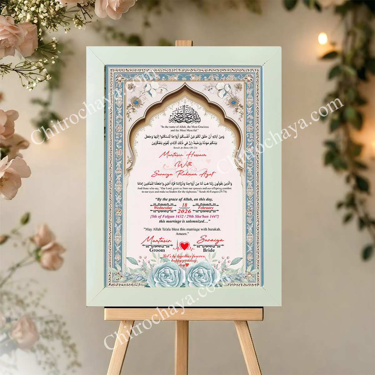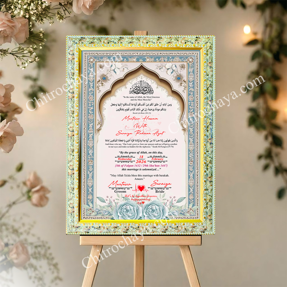 বিঃদ্রঃ নিকাহের তারিখ, বর-এর নাম এবং কনে-এর নাম লিখে দিন। অর্ডার বা যেকোনো তথ্যের জন্য আমাদের ইনবক্স করুন।